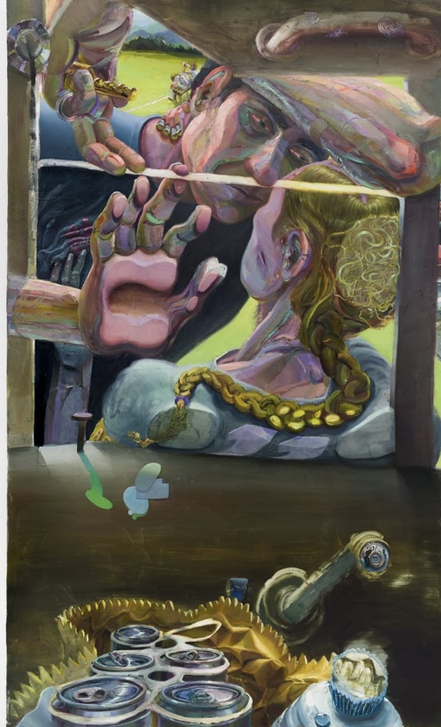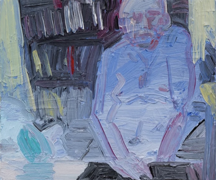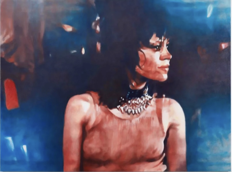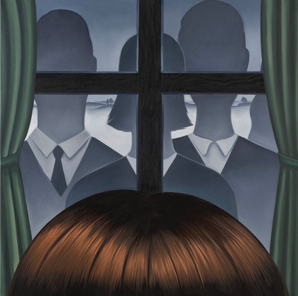 With a cinematic approach to composition, the artist transforms her canvas into a window, featuring three faceless, monochromatic figures outside. Rather than being observers ourselves, we become the subject of surveillance, with our proxy on our side of the frame.