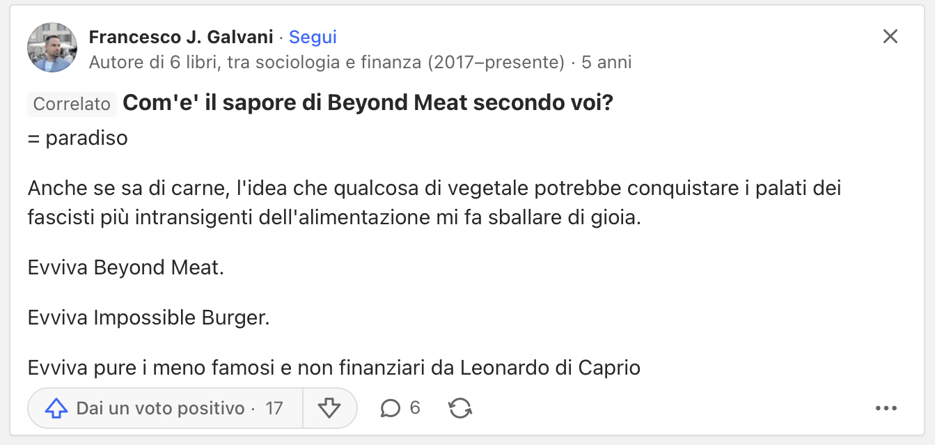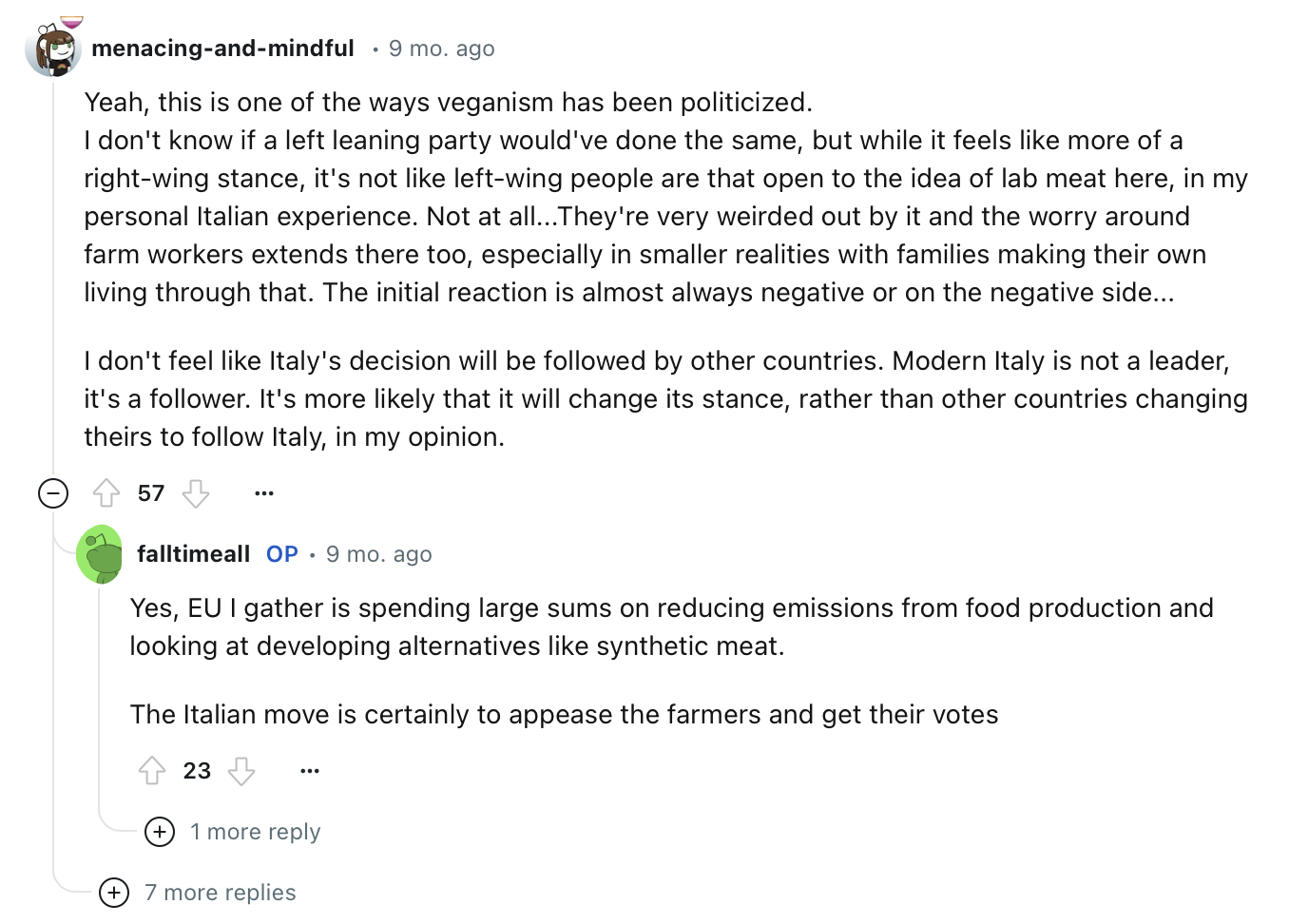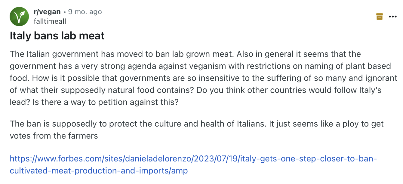 On another subthread, people were discussing political waves to ban lab grown meat in Italy to appease agriculture lobby, so not promoting plant based or lab-grown meat as people don’t see much difference, is not backed by ethical reasons or science. Posters shared their assumptions that “veganism has been politicized”, but both right-wing and left-wing people find lab meat gross.