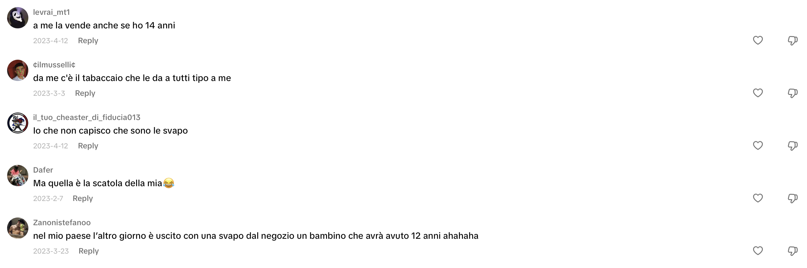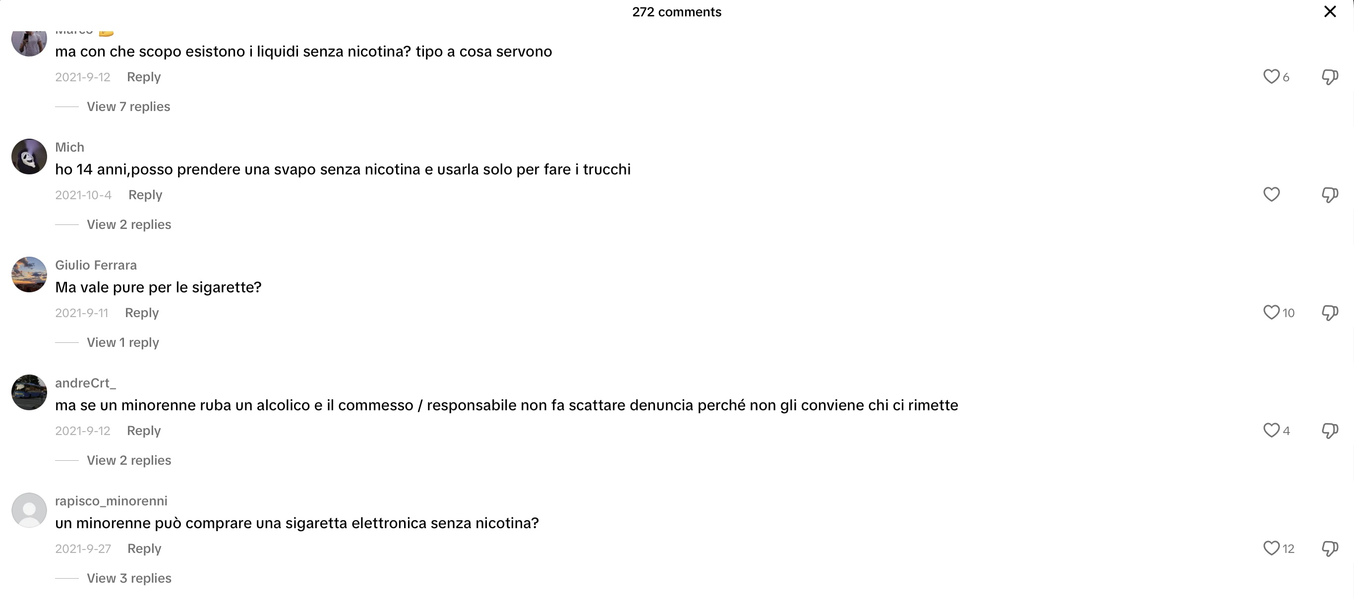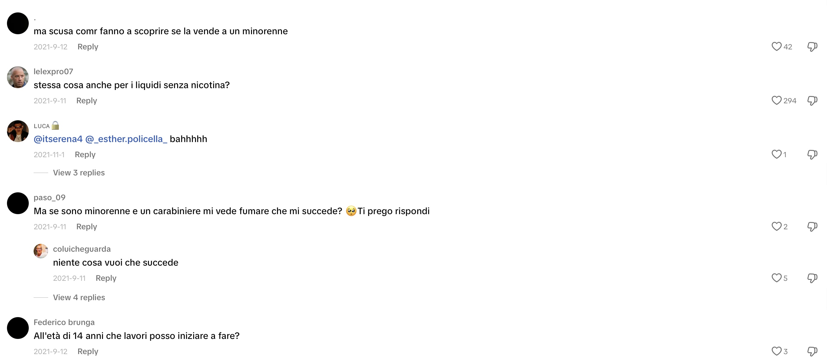 This time, I headed straight to TikTok to discover Gen Z trends on vaping in Italy and what people are saying online. Initially, it was challenging to ascertain the demographic of the speakers (whether they were teenagers or adults, their gender, etc.). However, I eventually came across conversations beneath a TikTok video discussing the legality and sale of e-cigarettes to minors. The individuals were deliberating on legal matters, questioning whether stores are permitted to sell these products and whether teens can use nicotine or non-nicotine e-cigarettes without being apprehended by law enforcement. Notably, a 14-year-old claimed that they can purchase a nicotine-free e-cigarette and use it to vape.