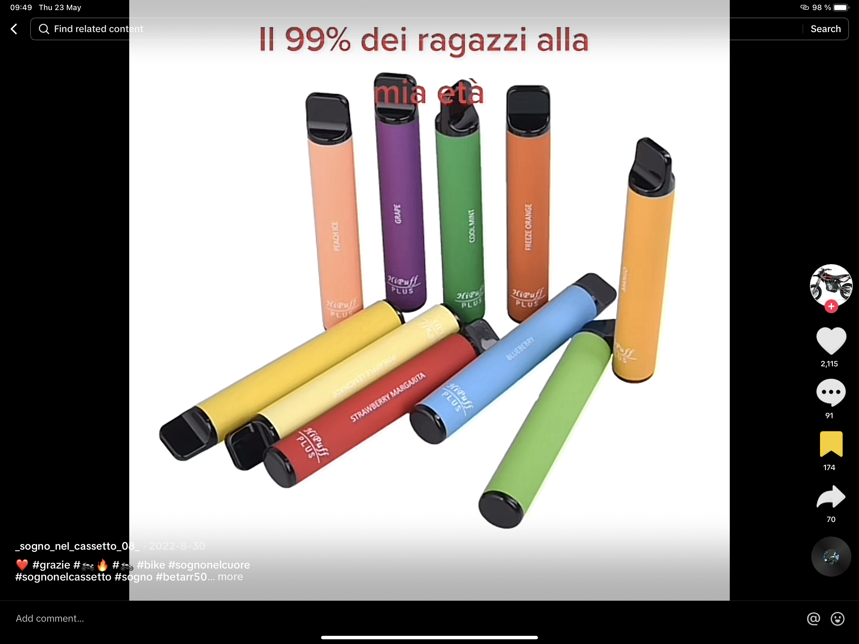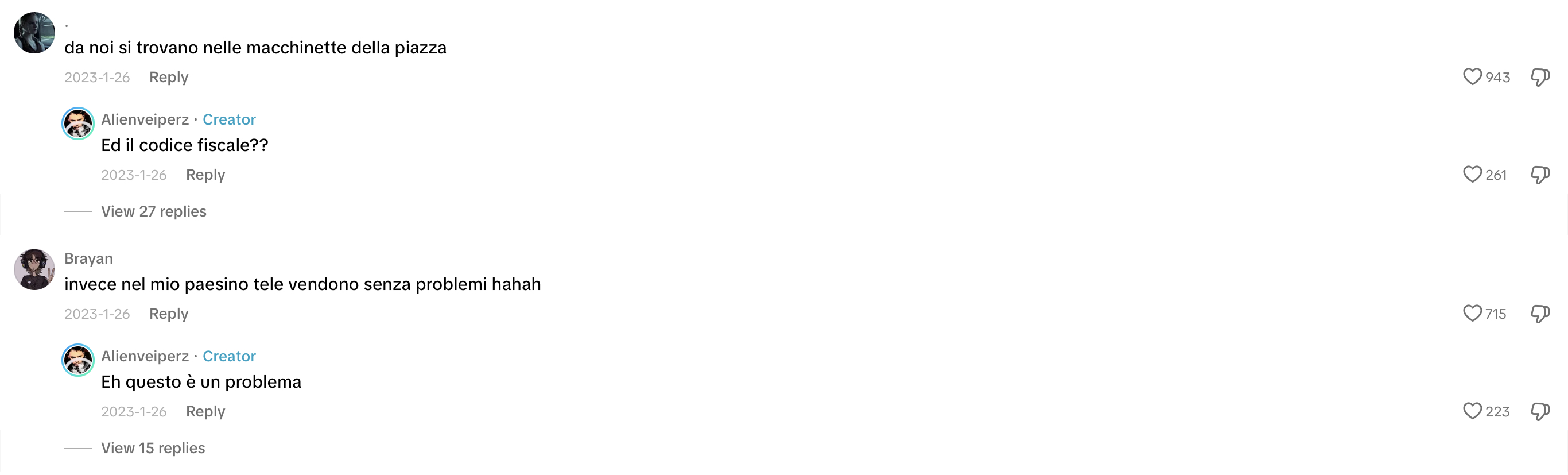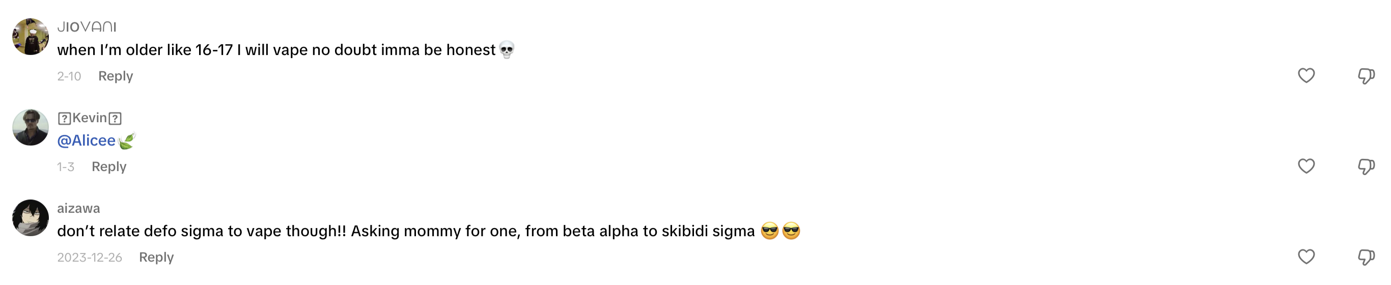 This time, I headed straight to TikTok to discover Gen Z trends on vaping in Italy and what people are saying online. Initially, it was challenging to ascertain the demographic of the speakers (whether they were teenagers or adults, their gender, etc.). However, I eventually came across conversations beneath a TikTok video discussing the legality and sale of e-cigarettes to minors. The individuals were deliberating on legal matters, questioning whether stores are permitted to sell these products and whether teens can use nicotine or non-nicotine e-cigarettes without being apprehended by law enforcement. Notably, a 14-year-old claimed that they can purchase a nicotine-free e-cigarette and use it to vape.