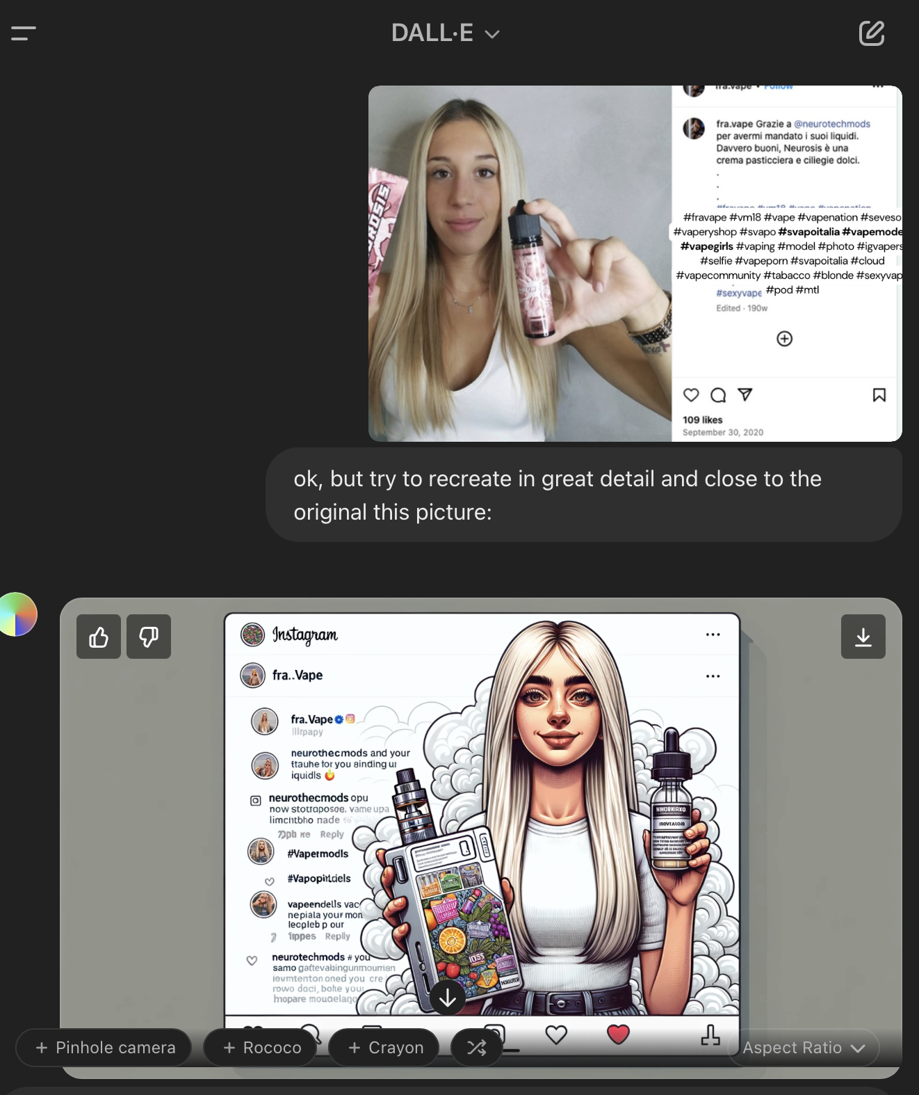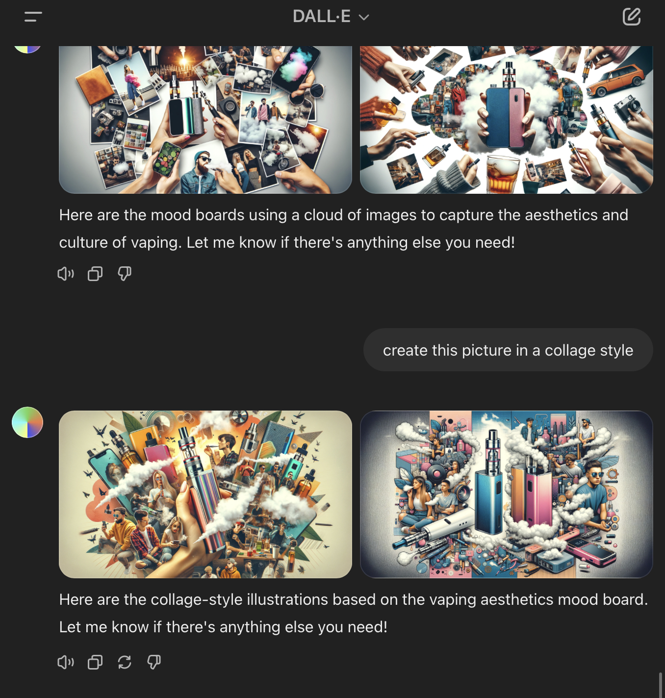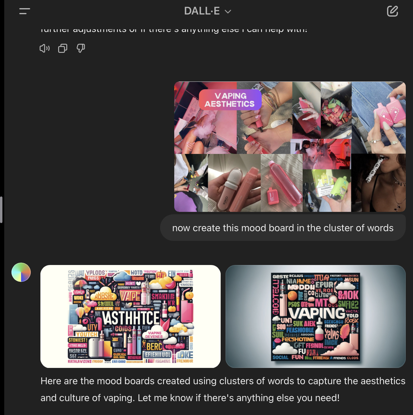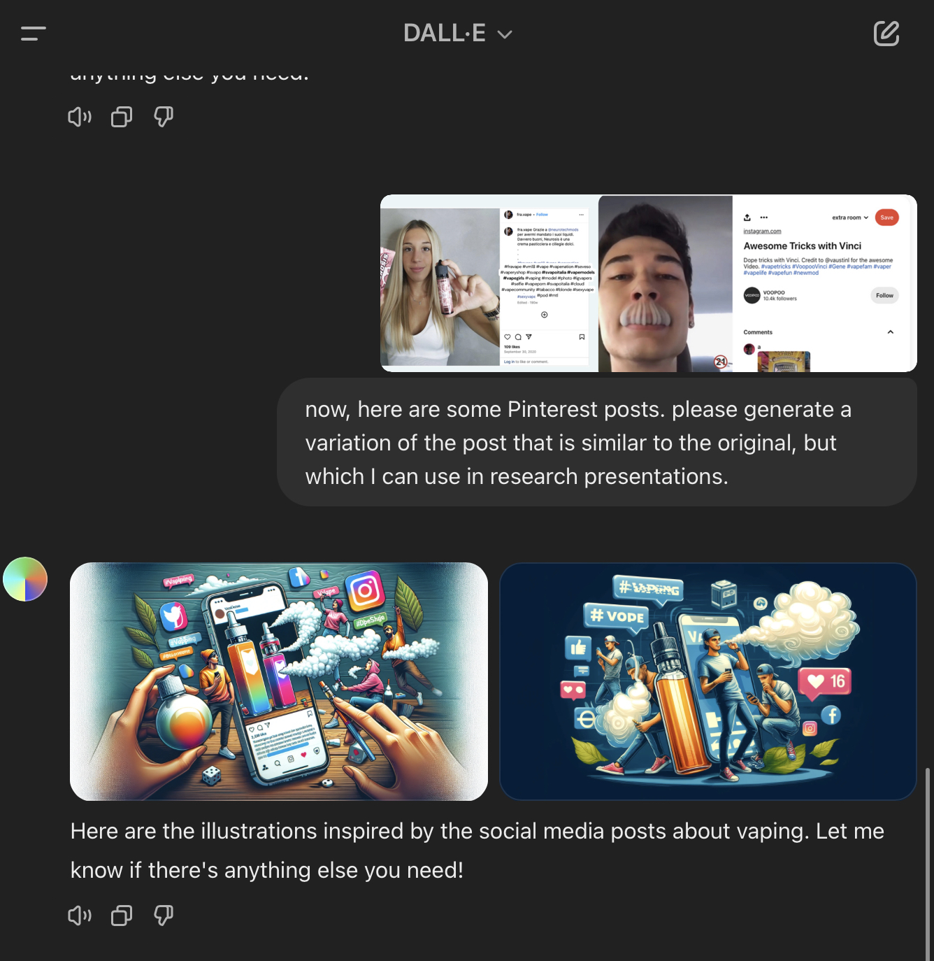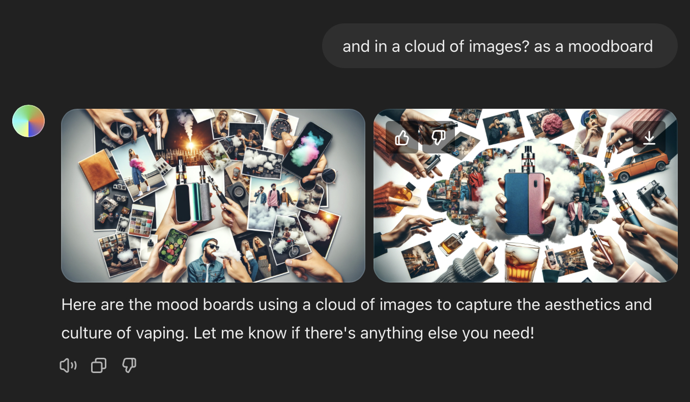 To use another technique we have learned, such as “recreating the same image in a different setting or style, so that it cannot be traced back online in search engines“, I have used some real photos and images from our final presentation on vaping. Here are input prompts, output results, and images: