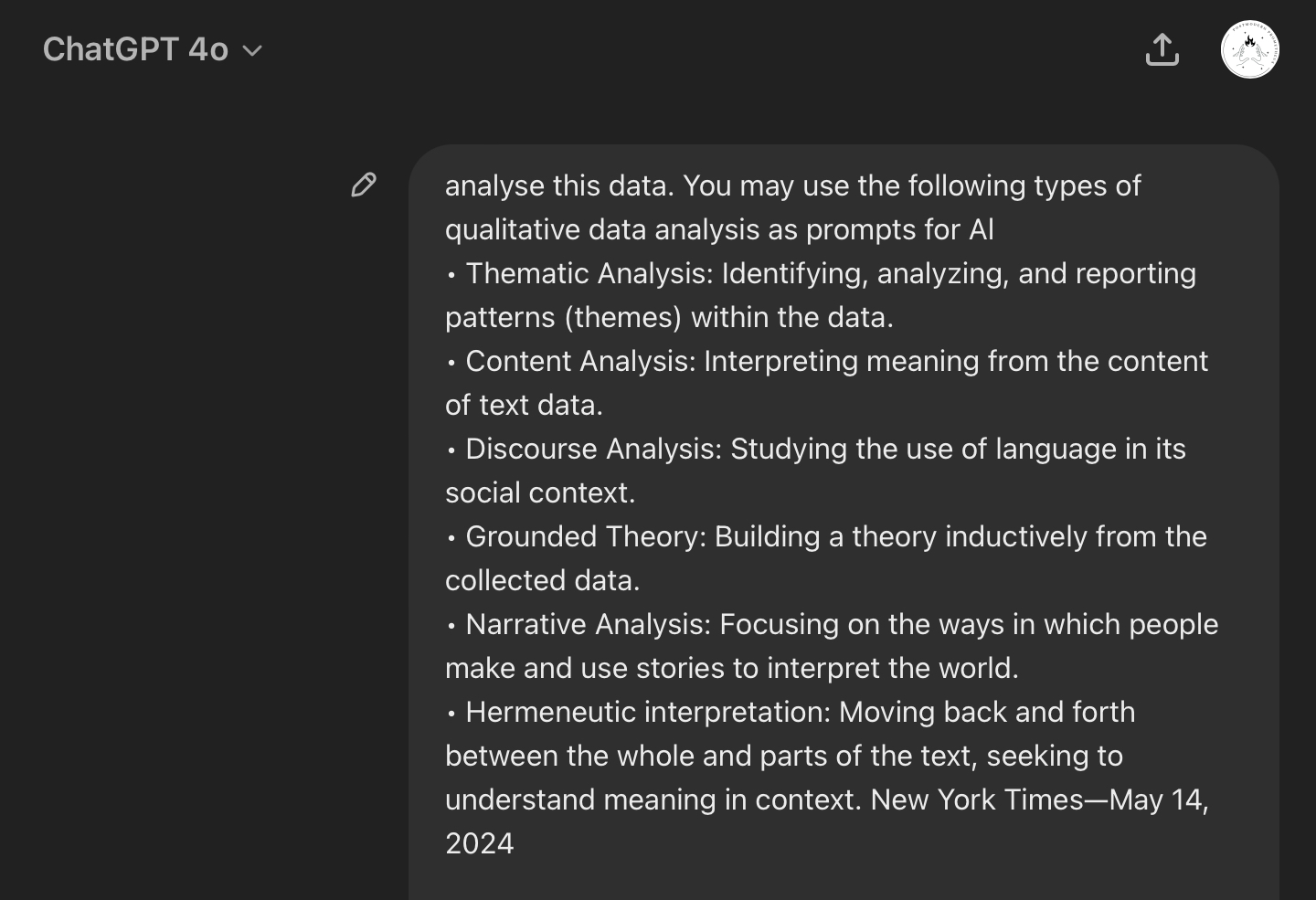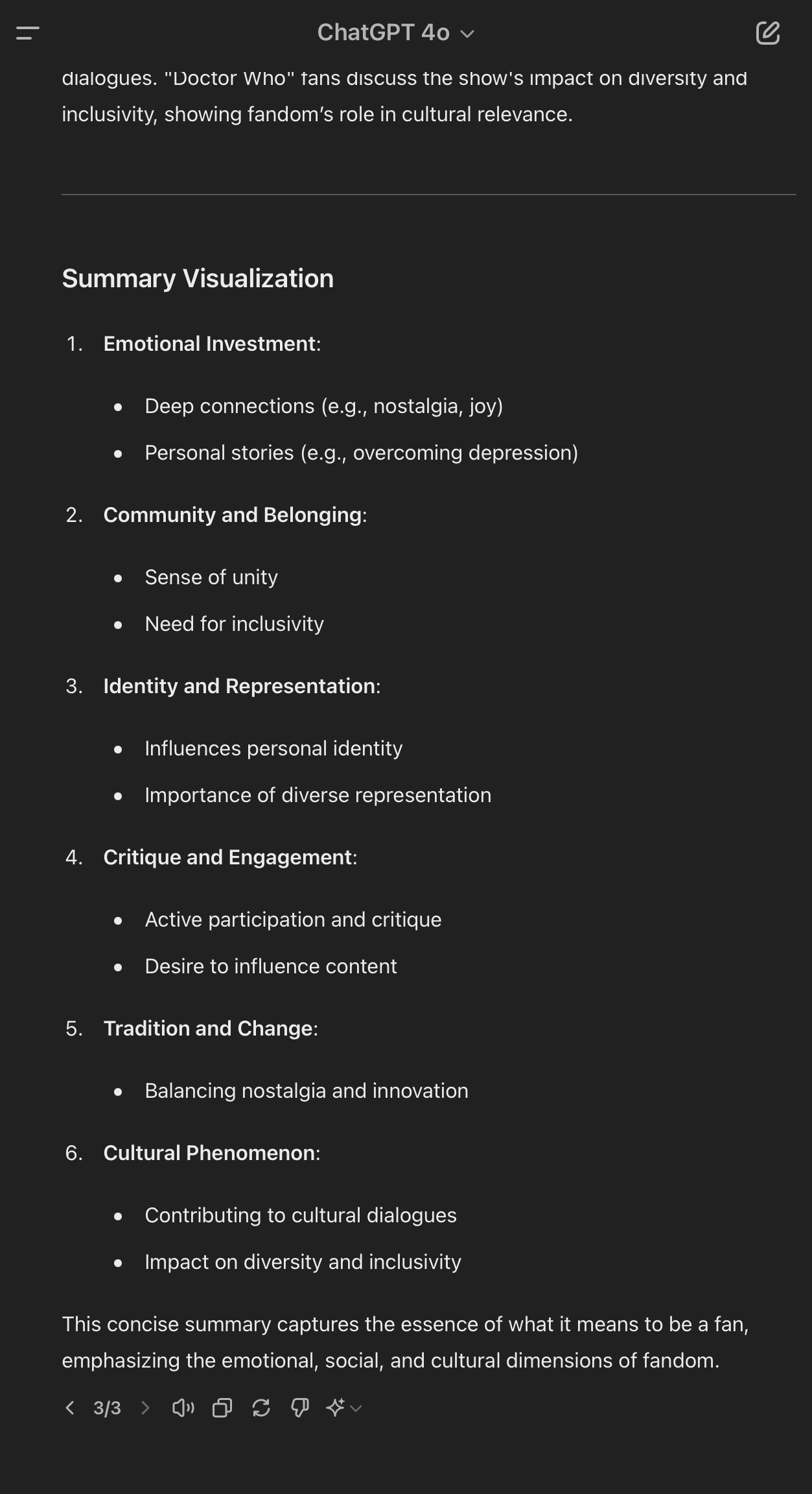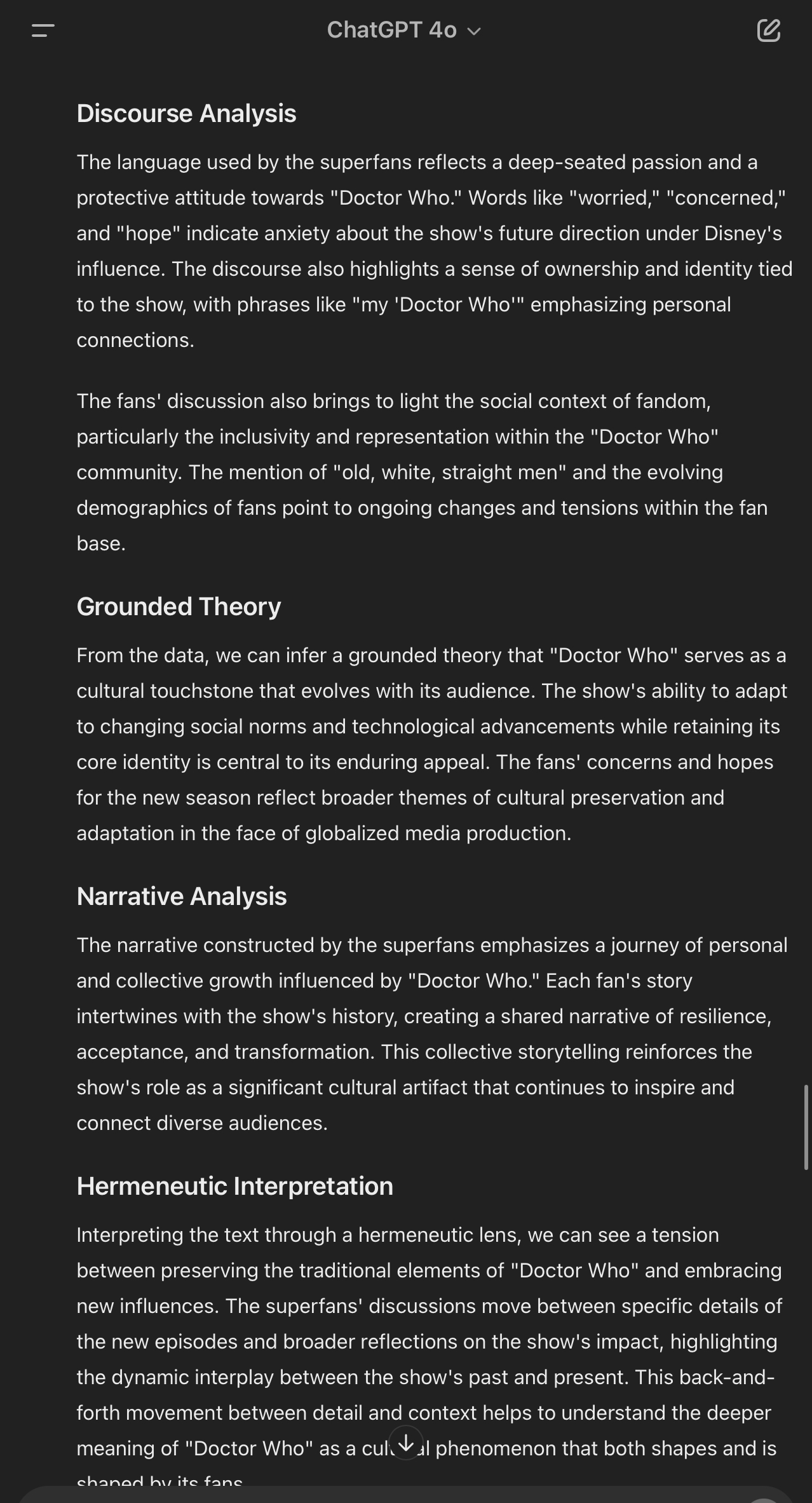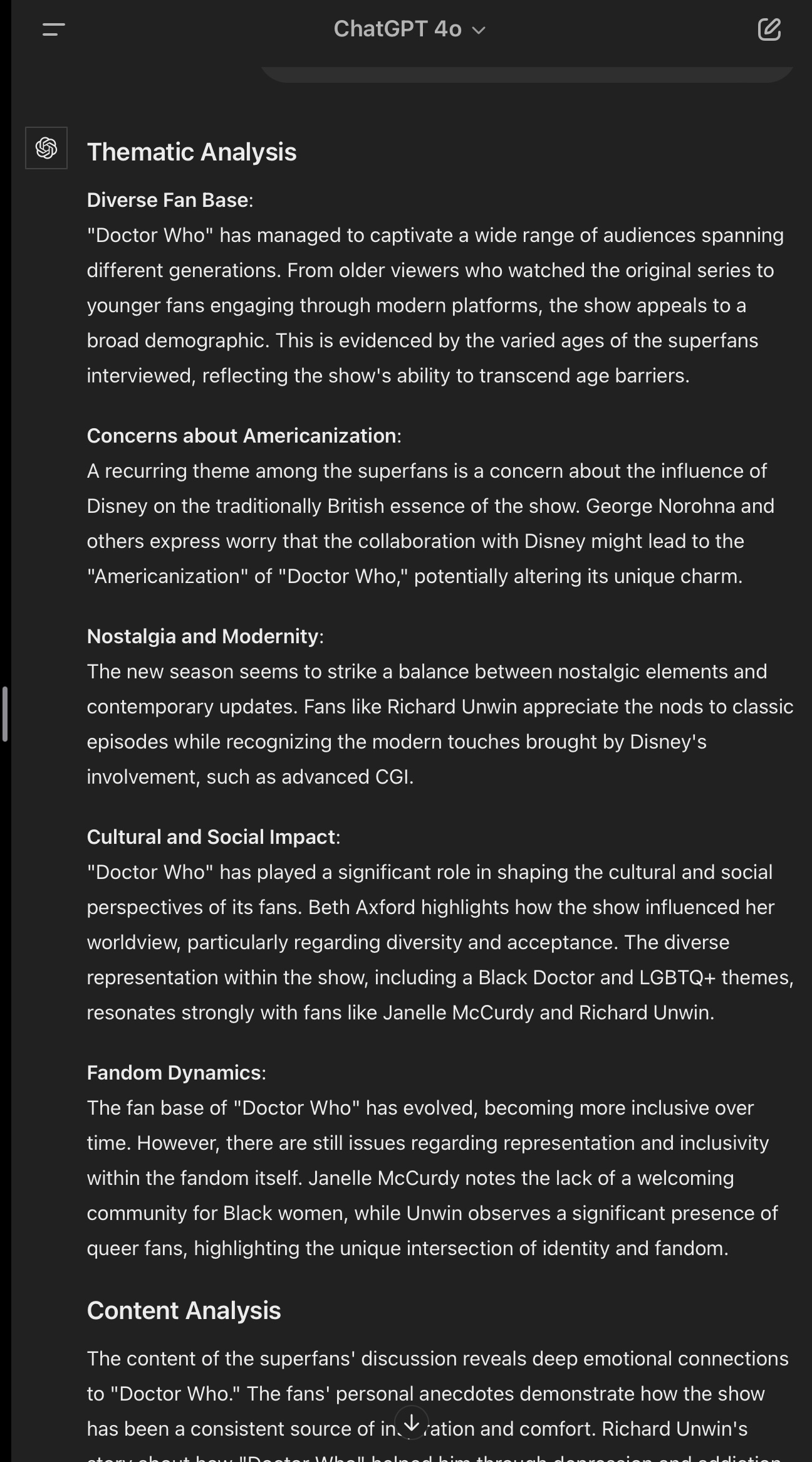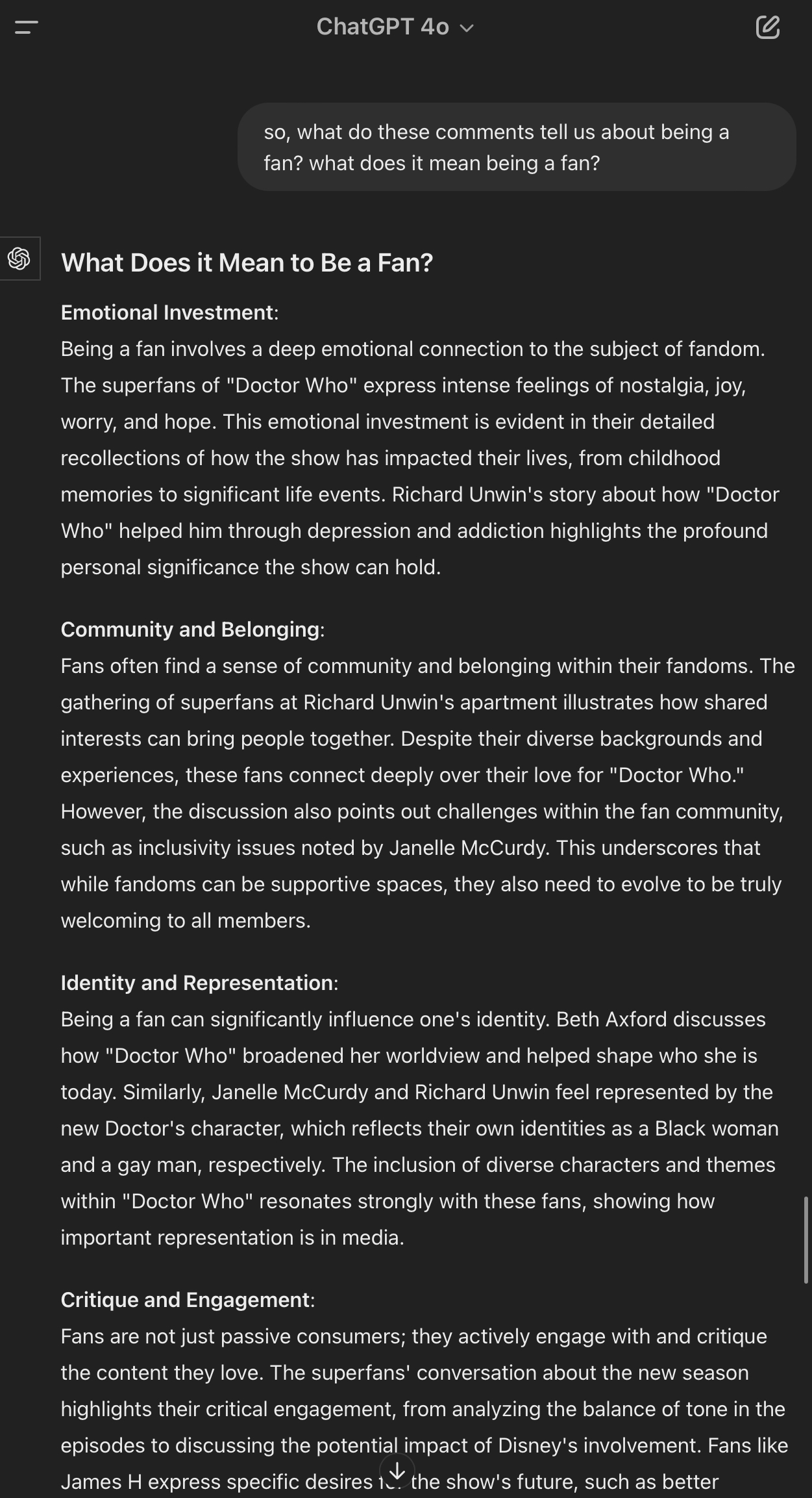 Today, we began with a brief exercise analyzing qualitative data using AI prompts and the ChatGPT model 4. I have attached screenshots of the prompts I used and the results I obtained while analyzing the Doctor Who fanbase. I provided various types of data analysis prompts for the AI, and ChatGPT responded with answers for each type, including an example of its argumentation supported by a relevant comment from the data. It also grouped the answers into relevant categories, even though I didn’t specifically request this. Following this, I inquired about the meaning of being a fan based on the provided data, and the AI categorized and organized meaningful clusters of comments based on their context, such as, for example, community building and emotional investment. Lastly, when I asked for a more concise output, it provided a summary visualization of all comments by cluster topics.
