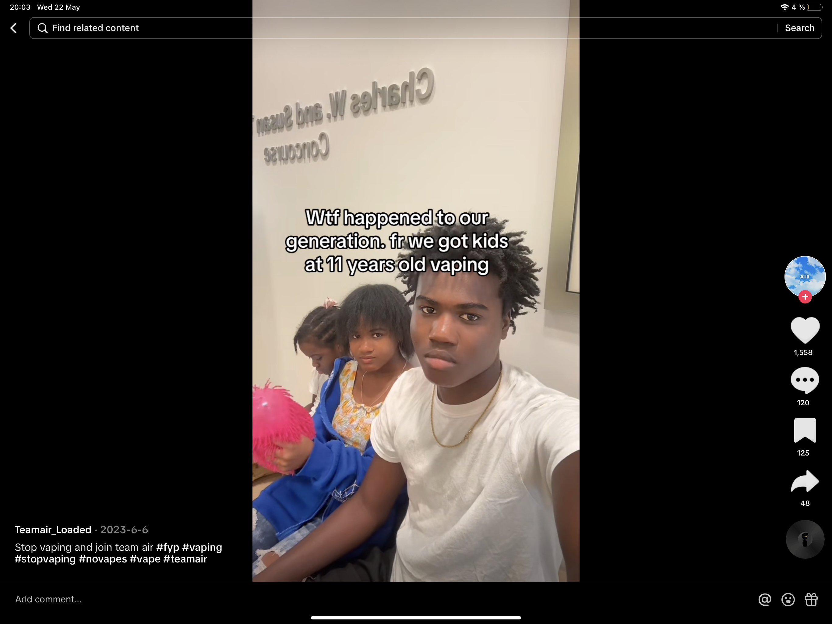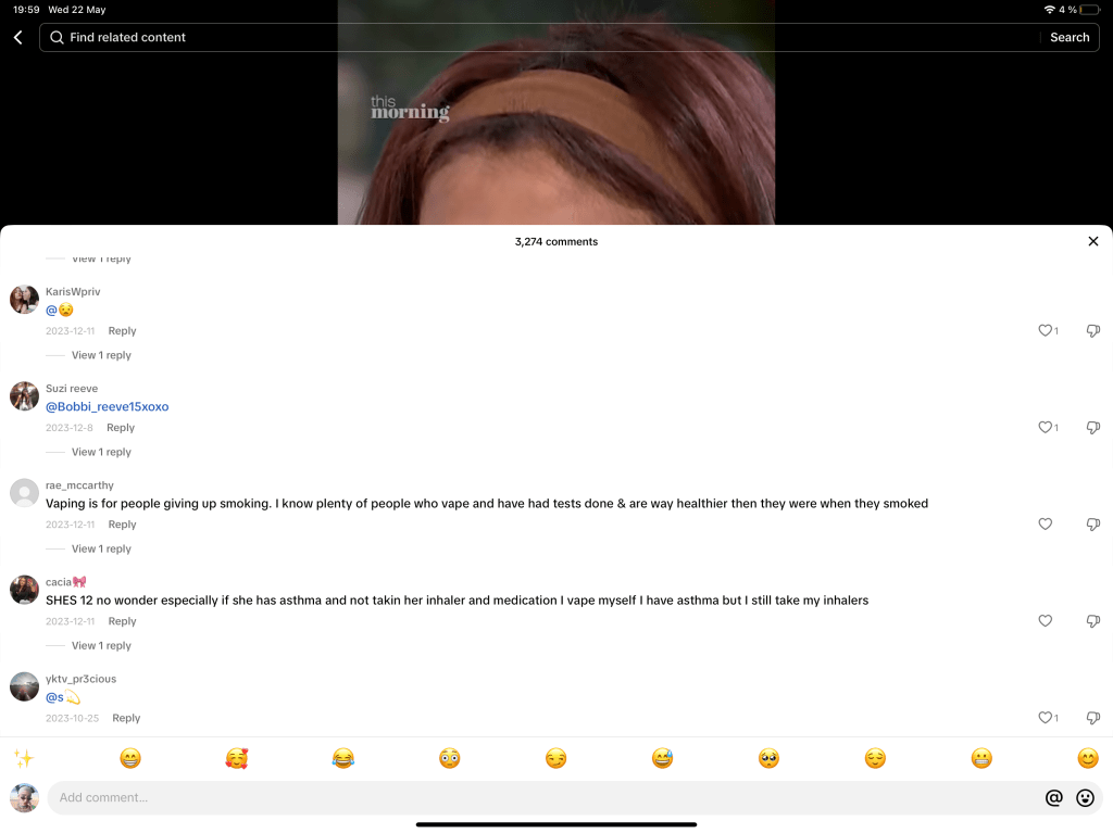 “Vaping is for people giving up smoking. I know plenty of people who vape and have had tests done & are way healthier then they were when they smoked.” “SHES 12 no wonder especially if she has asthma and not takin her inhaler and medication I vape myself I have asthma but I still take my inhalers.” — discussing the video where the 12 yo girl was suffering an asthma attack after vaping too much. She went to a TV show to talk about harm from vaping. Very early age and this is disturbing.