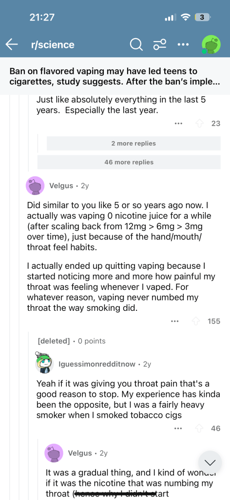 Another subthread discussed banning flavored vapes, although it can just bring teens back to traditional cigs smoking. Same happened to me when I vaped — I was attracted to the flavor, but my chest and throat started hurting. Then I read many negative and scary reviews, and I stopped. I also wanted to quit smoking tobacco. The main problem is — flavored vapes and disposable e-cigarettes. Designed to appeal to young people and new users, flavored vaporizers and disposable e-cigarettes — which are gaining popularity also thanks to their constant presence on social media — should “be a top priority for health authorities.”