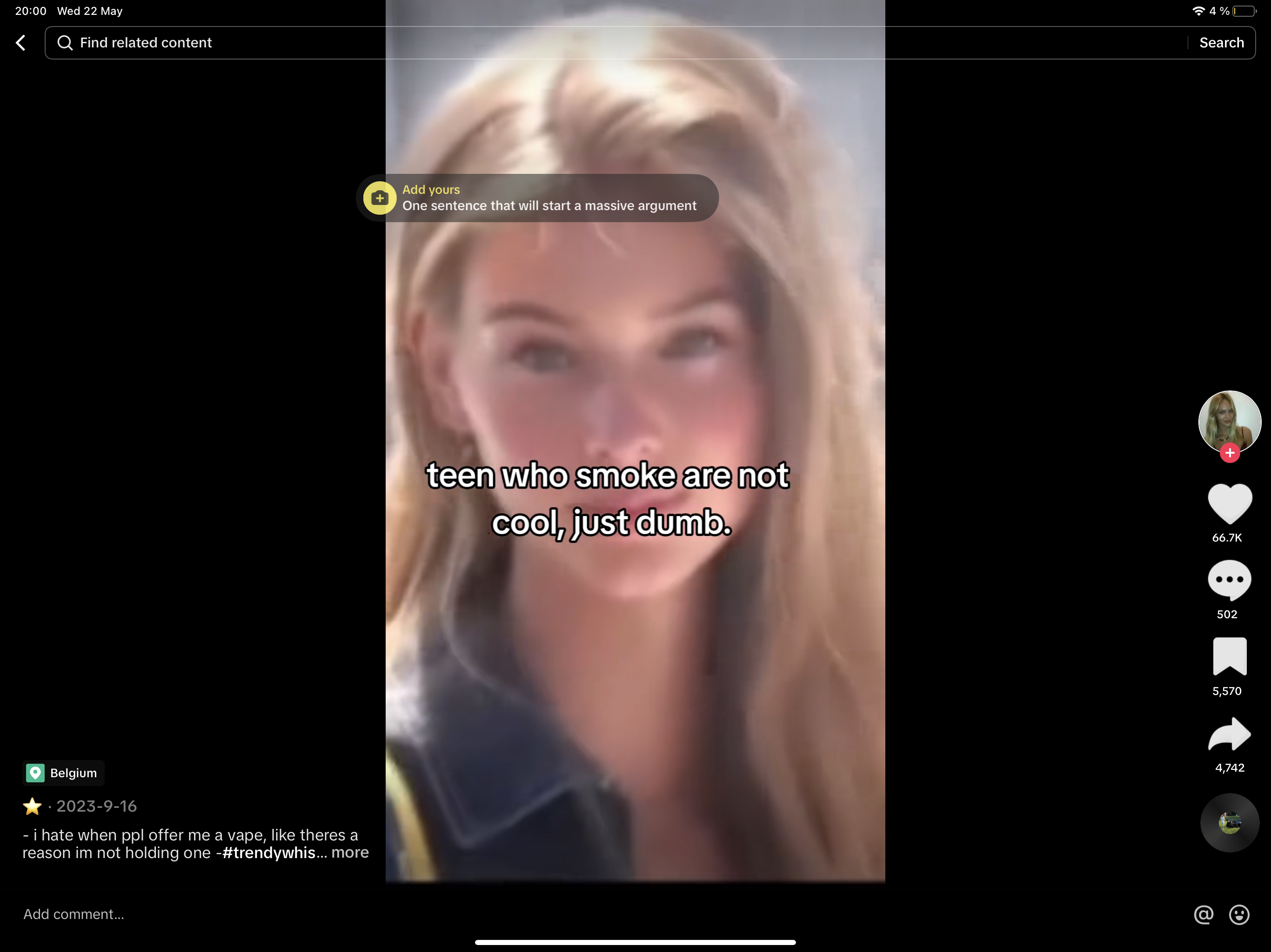 Many online discussions do not support vaping, portraying it as a generational issue, highlighting the limited understanding of the potential impact on their well-being by teenagers. Some commentators use memes to illustrate how vaping is perceived as shallow and unwise within their peer group, so this trend of being not 99% of vapers, but 1% of people with actual interests, could be used to our advantage.