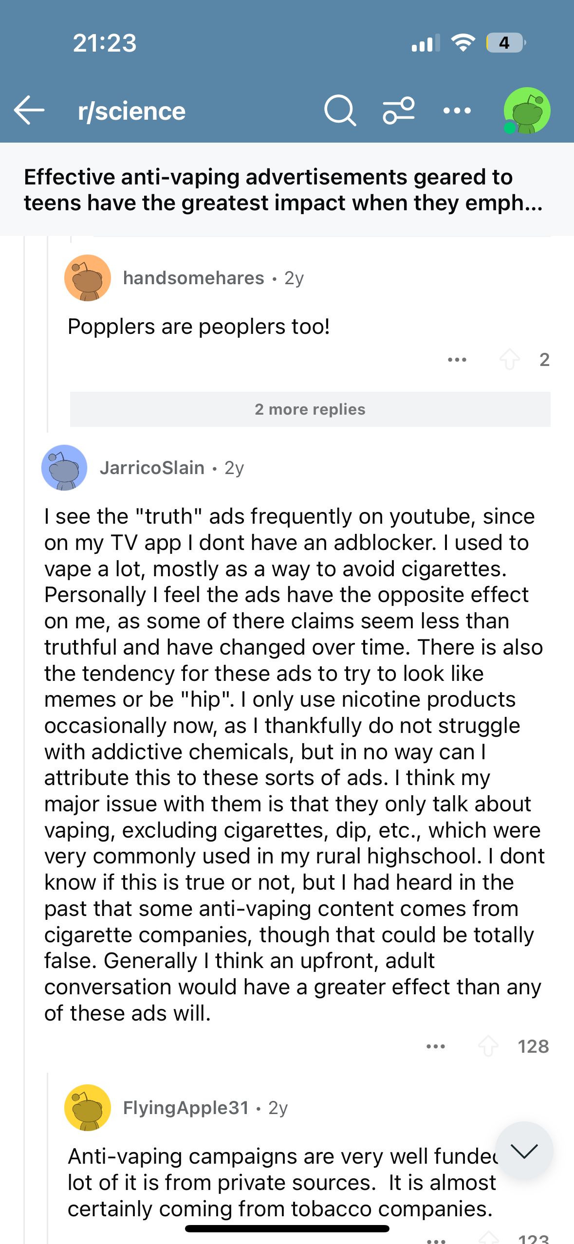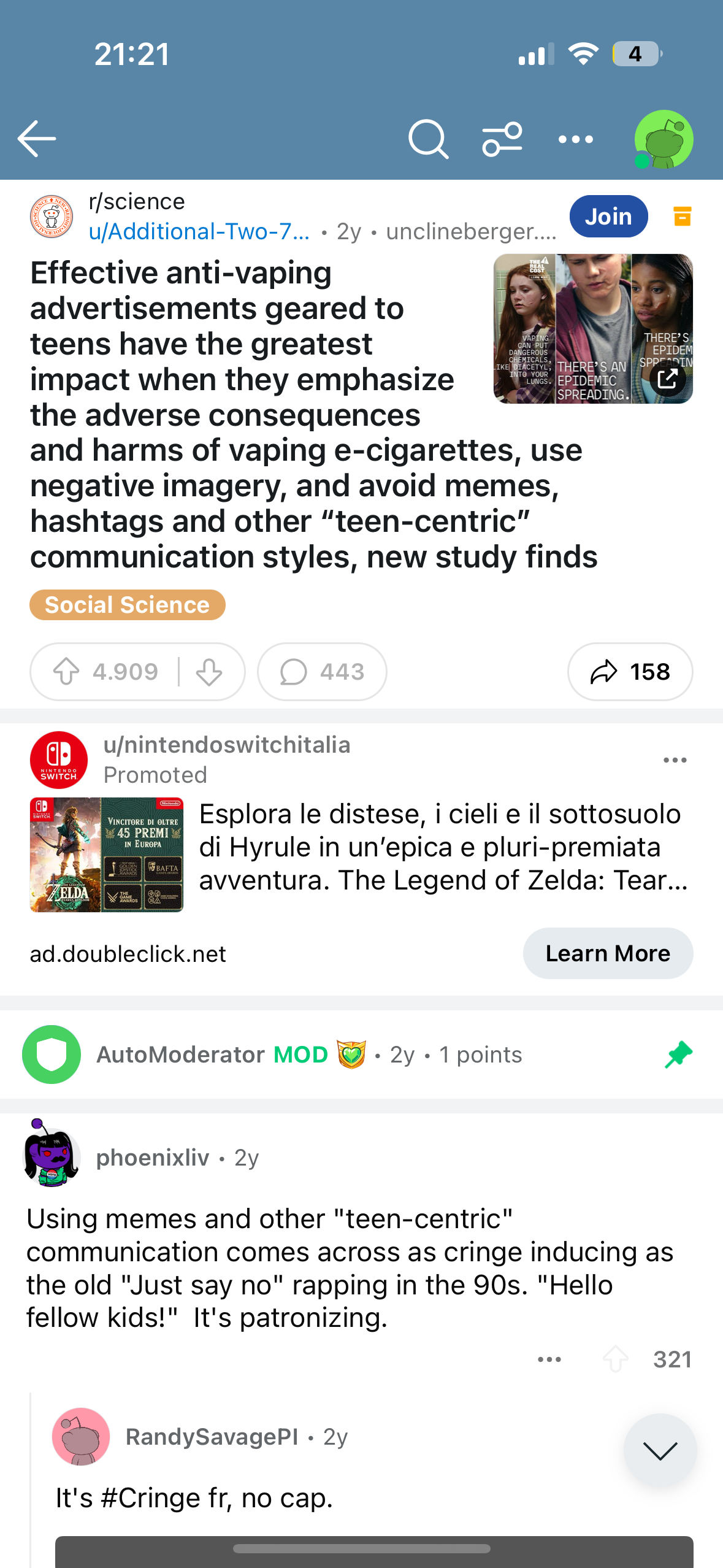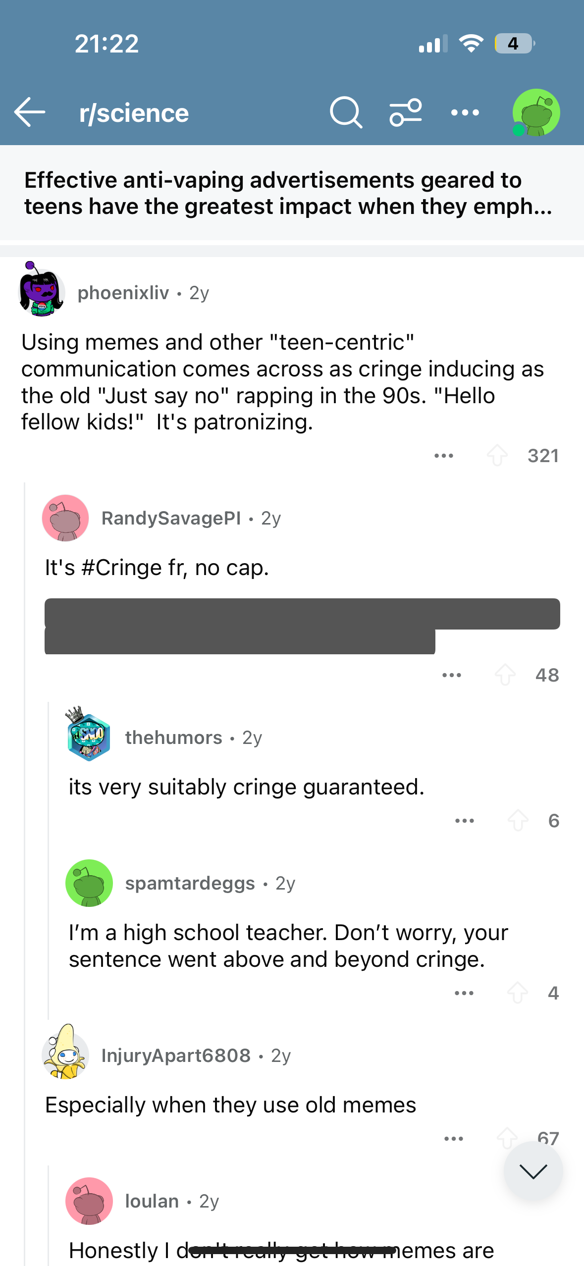 Satisfied with and curious about what I found on TikTok, I moved to my favorite realm— the world of subthreads on Reddit. An interesting discovery— effective approaches to discourage vaping: refrain from using memes or other “teen-centric” communication styles, and instead, employ negative imagery. An in-depth study reveals that anti-vaping advertisements targeted at teens have the strongest impact when they highlight the widespread epidemic and the adverse consequences and harms of vaping e-cigarettes, while steering clear of memes, hashtags, and other “teen-centric” communication styles. Some commenters expressed concern that leveraging memes and teenage slang would come across as “cringy” or awkward, noting, “Notably, ‘tobacco is whacko, if you’re a teen’ actually encourages teens to smoke.” Others suggested that a straightforward, adult conversation would have a greater effect than any of these ads.