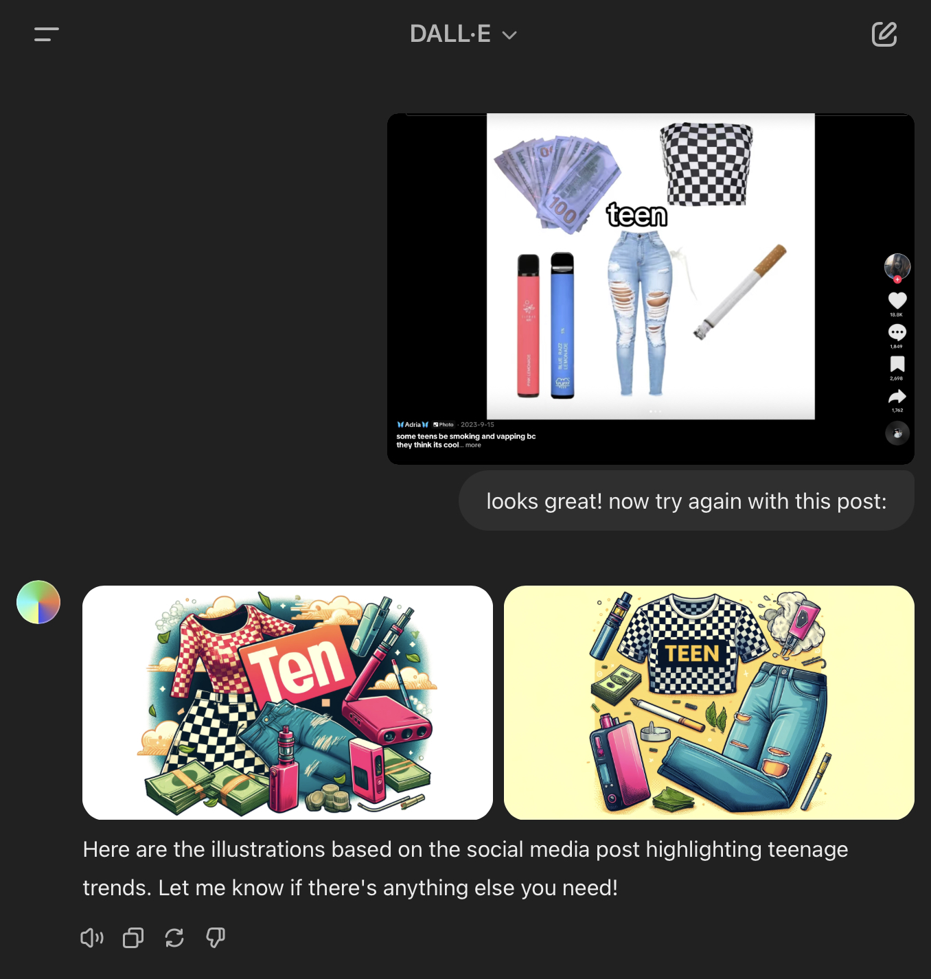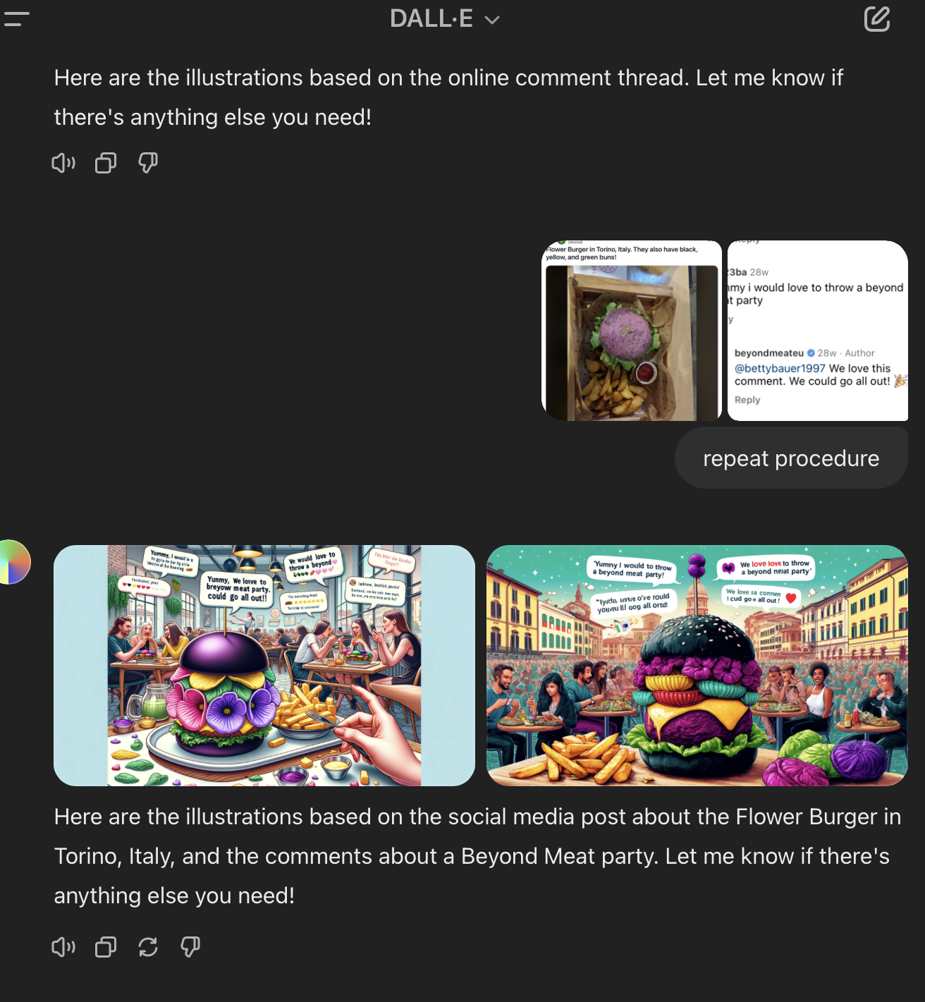 Final day of my immersion journey. I had to produce/find more imagery related to our insights; some of them should have been Gen-Al. I have already created many images for our social media campaign linked to our insightful comments based on the “typicals” DALL-E has in their library, so I decided to use other prompt techniques “just to play” with DALL-E. First, I used the technique “Data Dump”, using the prompt “Please use the following online post to generate an illustration based on its content”. Here are some inputs and outputs with images: