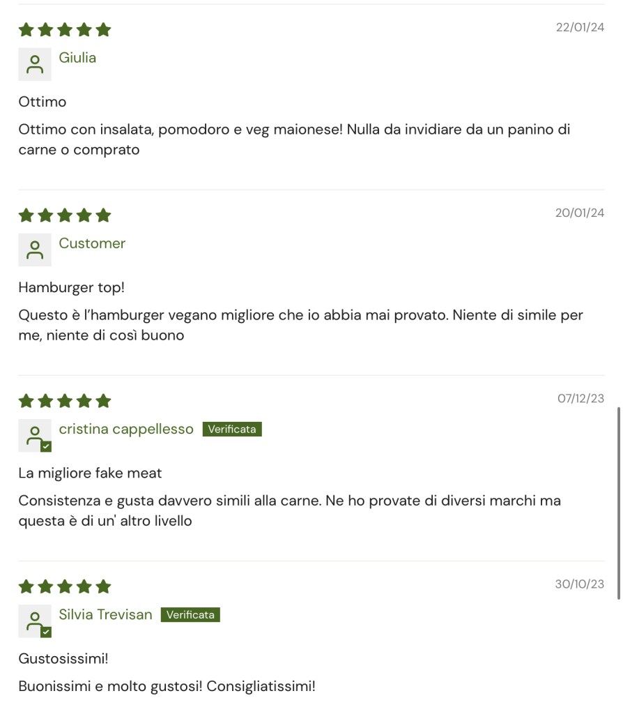 “Those burgers are some of the best you can find in Italy 🤩 much much better than beyond meat or impossible burger. They don’t pretend to be “meat”, and that’s what makes them so good 😎 I’ve had one near the office for some months and I was always eating there. Never been so satisfied to stop for lunch time. If you pass by, try it and enjoy 😋” — Commentary: again, consumers are happy that another plant-based option does-not taste or smell like real meat, not pretending to imitate, but in fact giving a valid alternative.