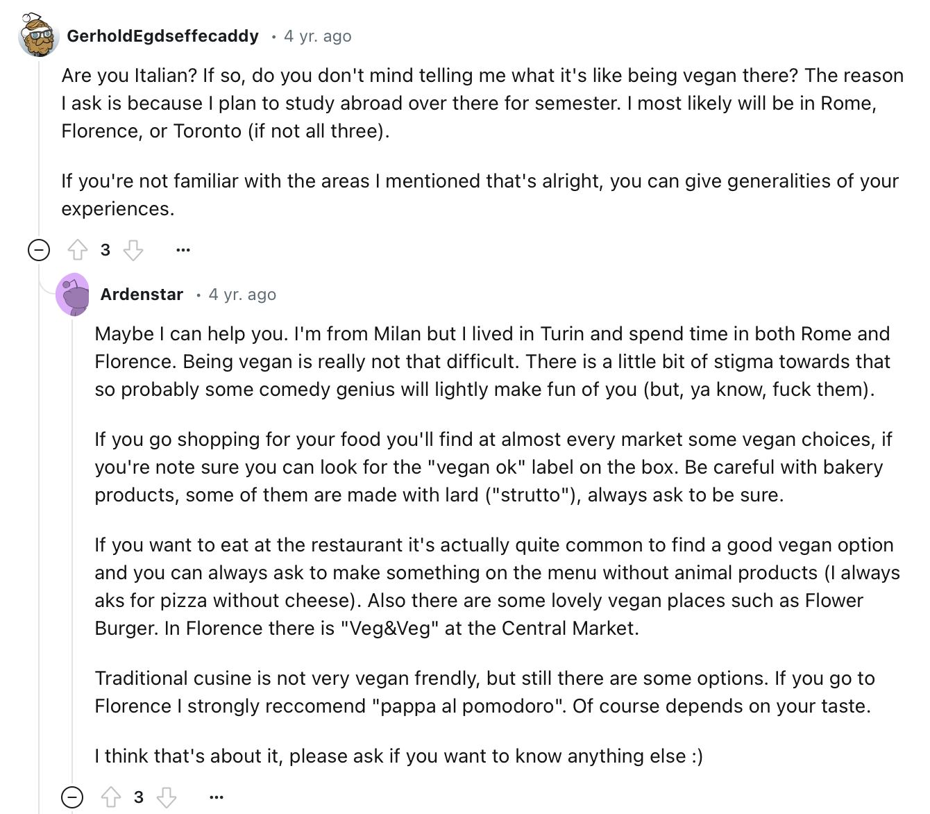 While searching for some Italian insights on the same thread, these posts caught my attention on the subthread within the same r/vegan community. They were discussing an alternative to BM and Impossible burgers found in a Flower Burger chain in Torino, Italy, with multiple colorful buns. One of the Reddit commenters shared that “traditional cuisine is not very vegan friendly” but you can find some vegan options, especially in vegan cafes such as Flower Burger, or markets. Maybe BM should start selling colorful plant-based gluten-free buns to match with their plant-based patties, would be a blast.
